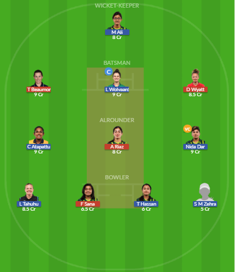 Tammy Beaumont(WK), Danielle Wyatt, Bismah Maroof(C), Maia Bouchier, Aliya Riaz, Tess Flintoff, Eyman Fatima, Fatima Sana, Ghulam Fatima, Nashra Sandhu, Anam Amin, Areesha Noor, Laura Delany, Sadaf Shamas, Gul Feroza(WK), Kainat Imtiaz, Fatima Khan