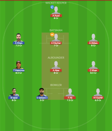Abdullah Asad(WK), Ali Mazhar, Tariq Owaisi, Aazi Shah, Muzammel Safdar, Zeeshan Khan, Asad Alee, Waleed Rahim, Umer Abbas, Muzaffar Kashif, Rashid Khan, Hasham Amir, Muhammed Shoaib, Gurwinder Dhillon, Arkam Abbas, Rizwan Gujjar(WK), Fahad Ali, Huzaifa Khan