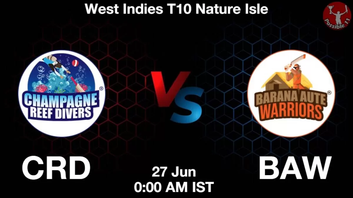 Champagne Reef Divers vs Barana Aute Warriors match prediction, CRD vs BAW dream11 match prediction, CRD vs BAW fantsy prediction, CRD vs BAW fantasy tips, West Indies T10 Nature Isle League match prediction, West Indies T10 Nature Isle League dream11 prediction, West Indies T10 Nature Isle series, CRD vs BAW dream11 Tips and Trics, CRD vs BAW Dream11 Winning team, CRD vs BAW dream11 grand league winning team, CRD vs BAW dream11 small league winning team, CRD vs BAW dream11 SL team, CRD vs BAW dream11 GL team, CRD vs BAW todays Dream11 Winning Team, CRD vs BAW match updates, List of Cricket matches on Thursday 27th June 2024,