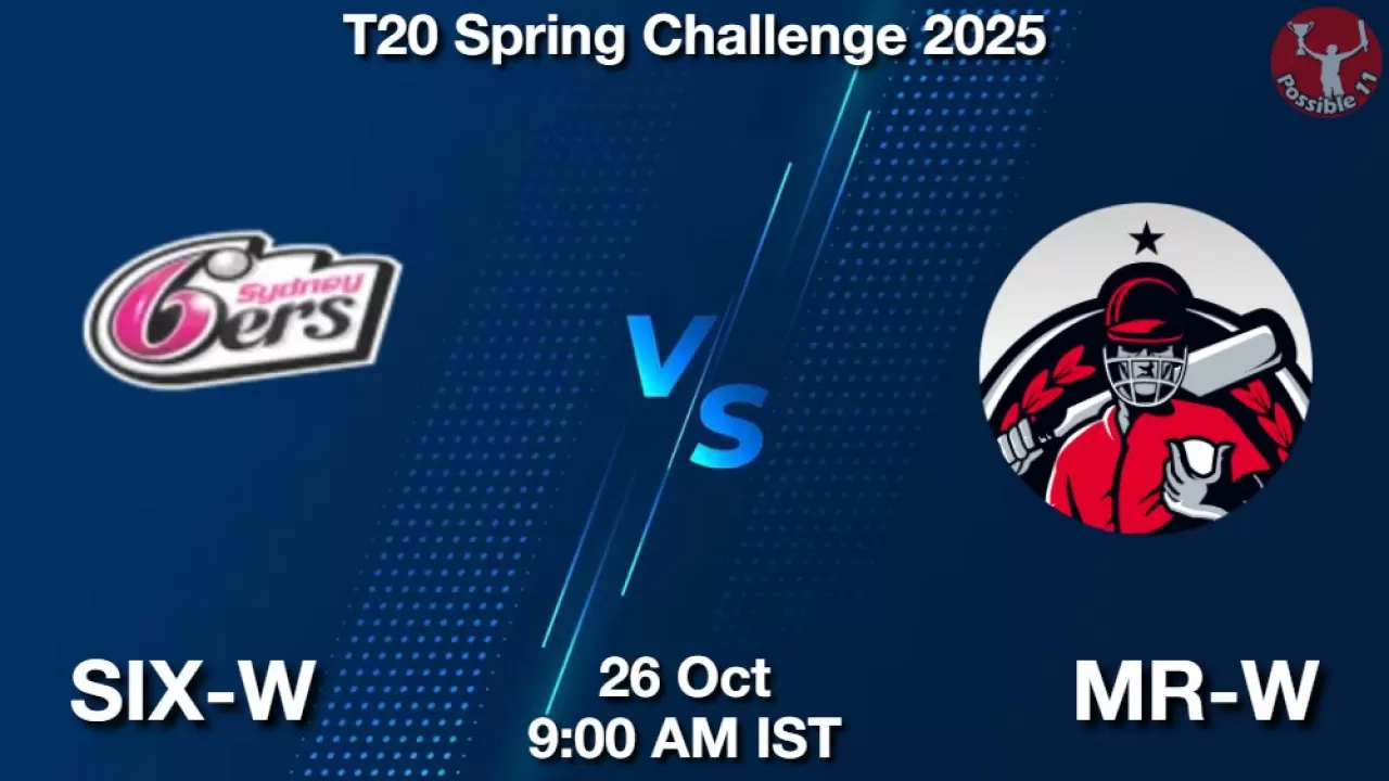 A-2, Dream11 Cricket team prediction for SIX-W vs MR-W, Get expert fantasy tips, injury updates, small league safe teams, and grand league risky players from the Possible11 App.