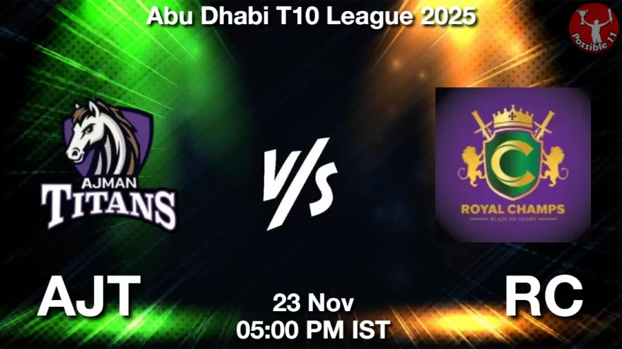 AJT vs RC Match Prediction, Abu Dhabi T10 League 2025, Ajman Titans vs Royal Champs Match Preview, Probable Playing 11, Match winning Tips, Live Match Score, Pitch Report, Injury & Updates.