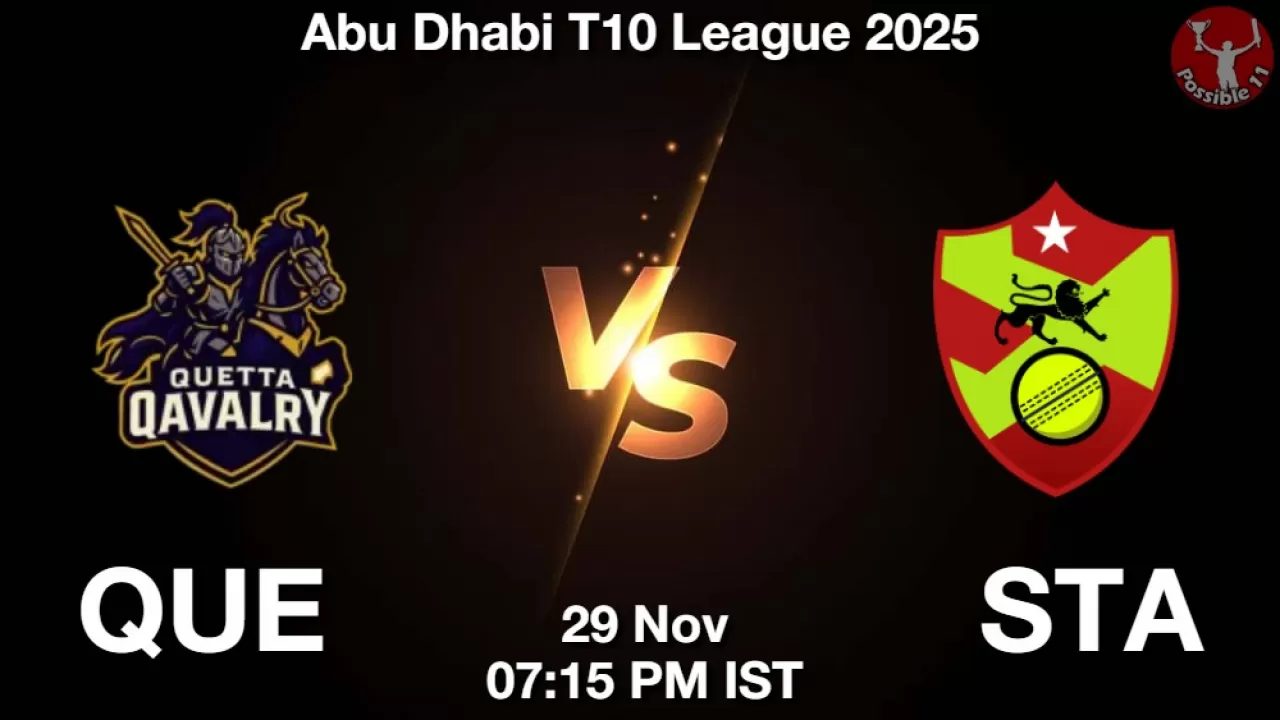 QUE vs STA Match Prediction, Abu Dhabi T10 League 2025, Quetta Qavalry vs Stallions Match Preview, Probable Playing 11, Match winning Tips, Live Match Score, Pitch Report, Injury & Updates.