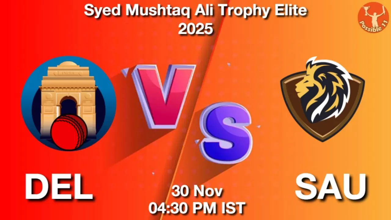DEL vs SAU Match Prediction, Syed Mushtaq Ali Trophy Elite 2025, Delhi vs Saurashtra Match Preview, Probable Playing 11, Match winning Tips, Live Match Score, Pitch Report, Injury & Updates.