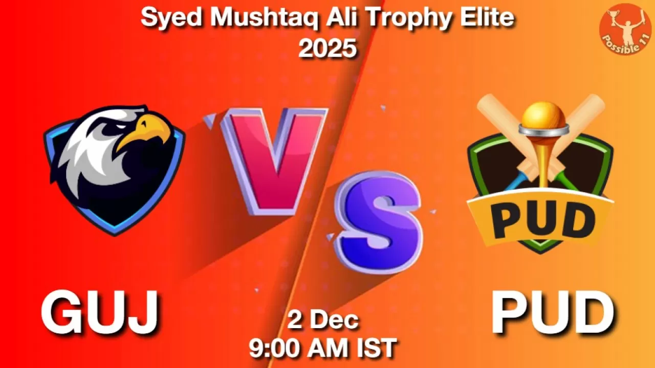 GUJ vs PUD Match Prediction, Syed Mushtaq Ali Trophy Elite 2025, Gujarat vs Puducherry Match Preview, Probable Playing 11, Match winning Tips, Live Match Score, Pitch Report, Injury & Updates.