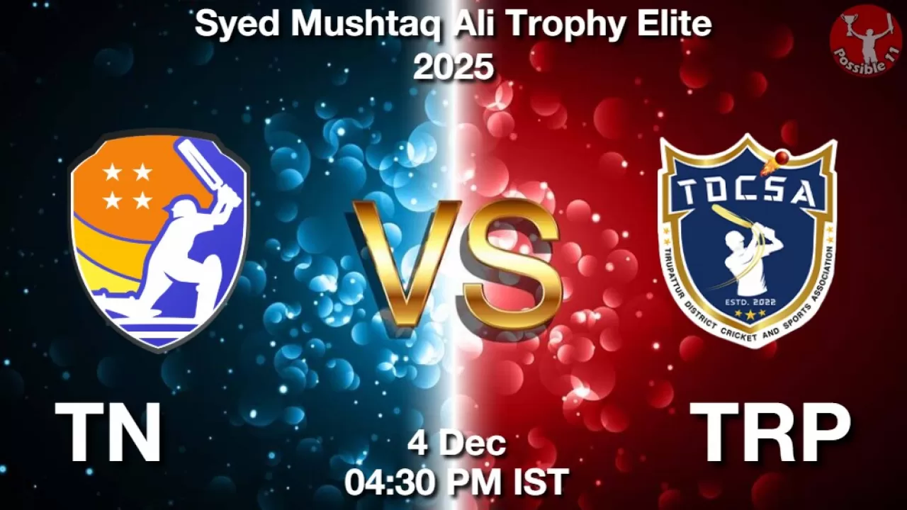 TN vs TRP Match Prediction, Syed Mushtaq Ali Trophy Elite 2025, Tamil Nadu vs Tripura Match Preview, Probable Playing 11, Match winning Tips, Live Match Score, Pitch Report, Injury & Updates.