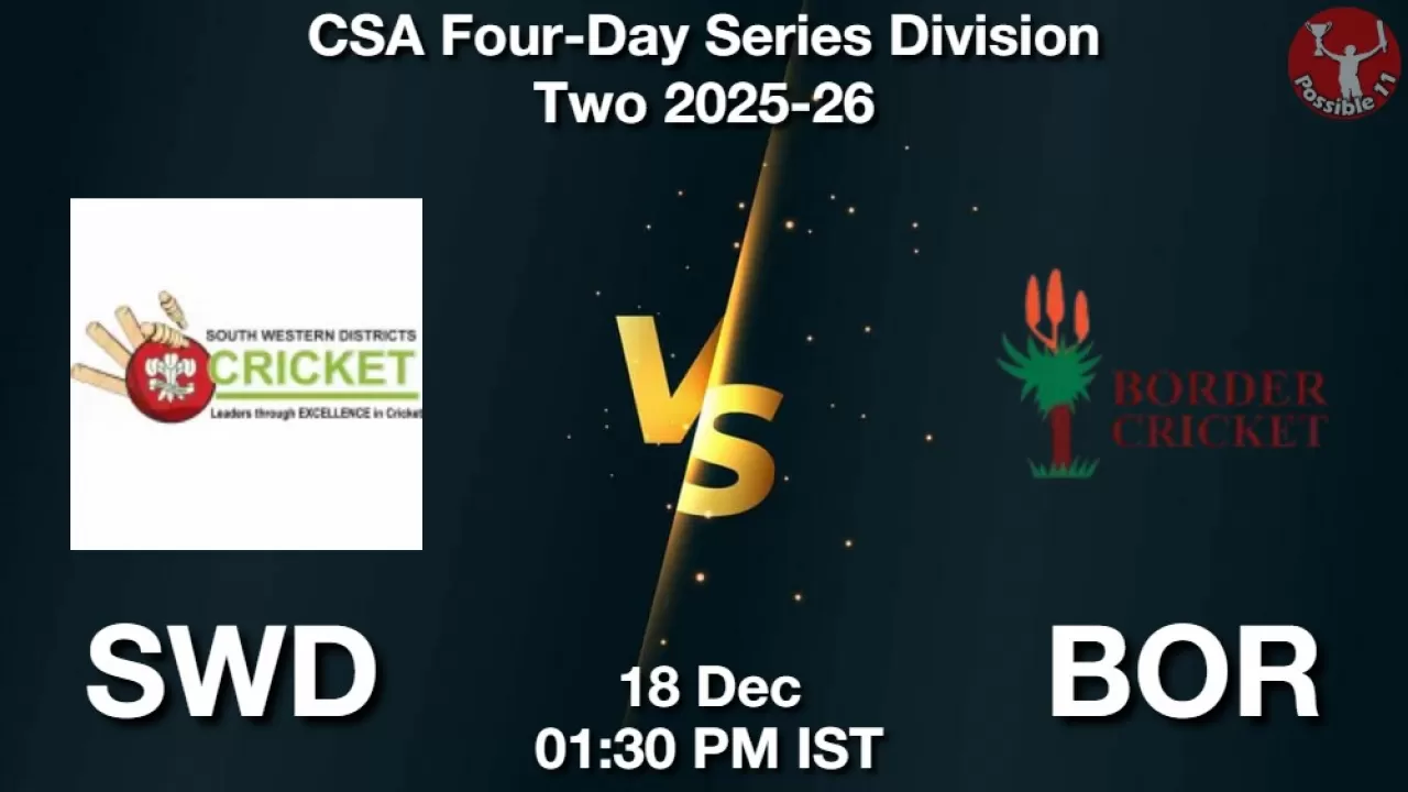 SWD vs BOR Match Prediction, CSA Four-Day Series Division Two 2025-26, South Western Districts vs Border Match Preview, Probable Playing 11, Match winning Tips, Live Match Score, Pitch Report, Injury & Updates.