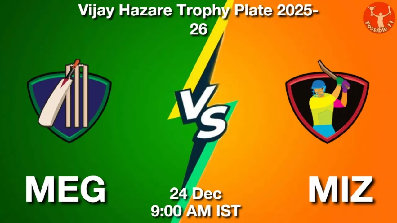 MEG vs MIZ Match Prediction, Vijay Hazare Trophy Plate 2025-26, Meghalaya vs Mizoram Match Preview, Probable Playing 11, Match winning Tips, Live Match Score, Pitch Report, Injury & Updates.