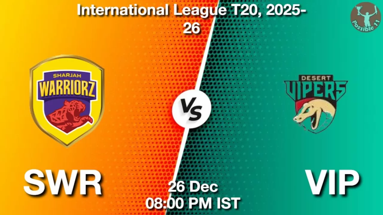 SWR vs VIP Match Prediction, International League T20, 2025-26, Sharjah Warriors vs Desert Vipers Match Preview, Probable Playing 11, Match winning Tips, Live Match Score, Pitch Report, Injury & Updates.