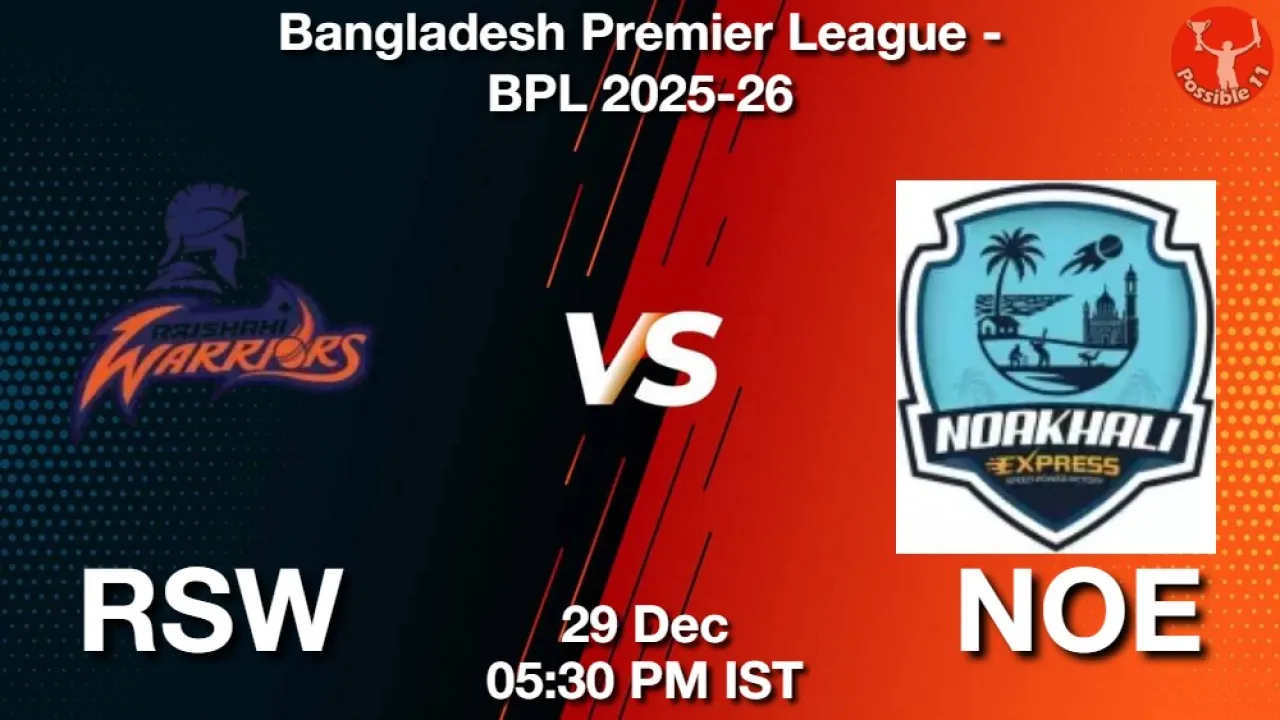 RSW vs NOE Match Prediction, Bangladesh Premier League - BPL 2025-26, Rajshahi Warriors vs Noakhali Express Match Preview, Probable Playing 11, Match winning Tips, Live Match Score, Pitch Report, Injury & Updates.