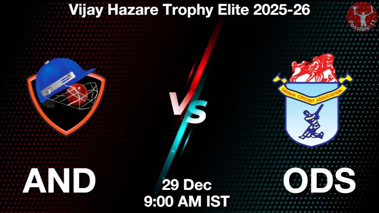 AND vs ODS Match Prediction, Vijay Hazare Trophy Elite 2025-26, Andhra vs Odisha Match Preview, Probable Playing 11, Match winning Tips, Live Match Score, Pitch Report, Injury & Updates.