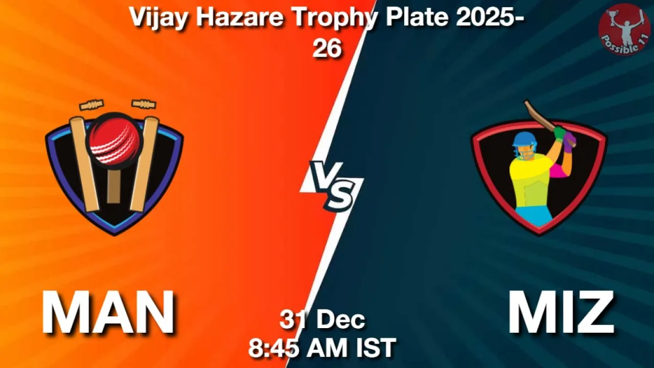 MAN vs MIZ Match Prediction, Vijay Hazare Trophy Plate 2025-26, Manipur vs Mizoram Match Preview, Probable Playing 11, Match winning Tips, Live Match Score, Pitch Report, Injury & Updates.