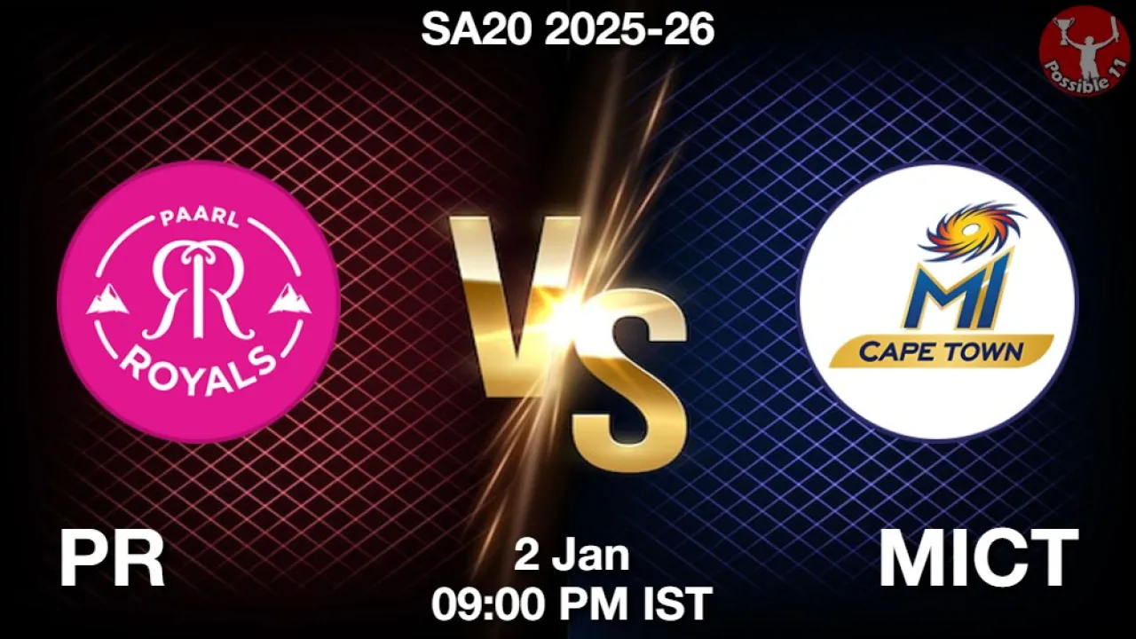 PR vs MICT Match Prediction, SA20 2025-26, Paarl Royals vs Mi Cape Town Match Preview, Probable Playing 11, Match winning Tips, Live Match Score, Pitch Report, Injury & Updates.
