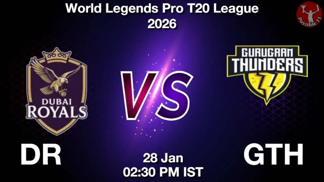 DR vs GTH Match Prediction, World Legends Pro T20 League 2026, Dubai Royals vs Gurugram Thunders Match Preview, Probable Playing 11, Match winning Tips, Live Match Score, Pitch Report, Injury & Updates.
