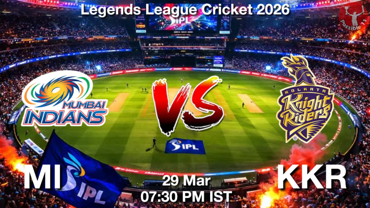 MI vs KKR Match Preview: Mumbai Indians is set to take on KKR in Legends League Cricket 2026 on Sunday, 29 March 2026 at 07:30 PM IST at Wankhede Stadium, Mumbai, India.