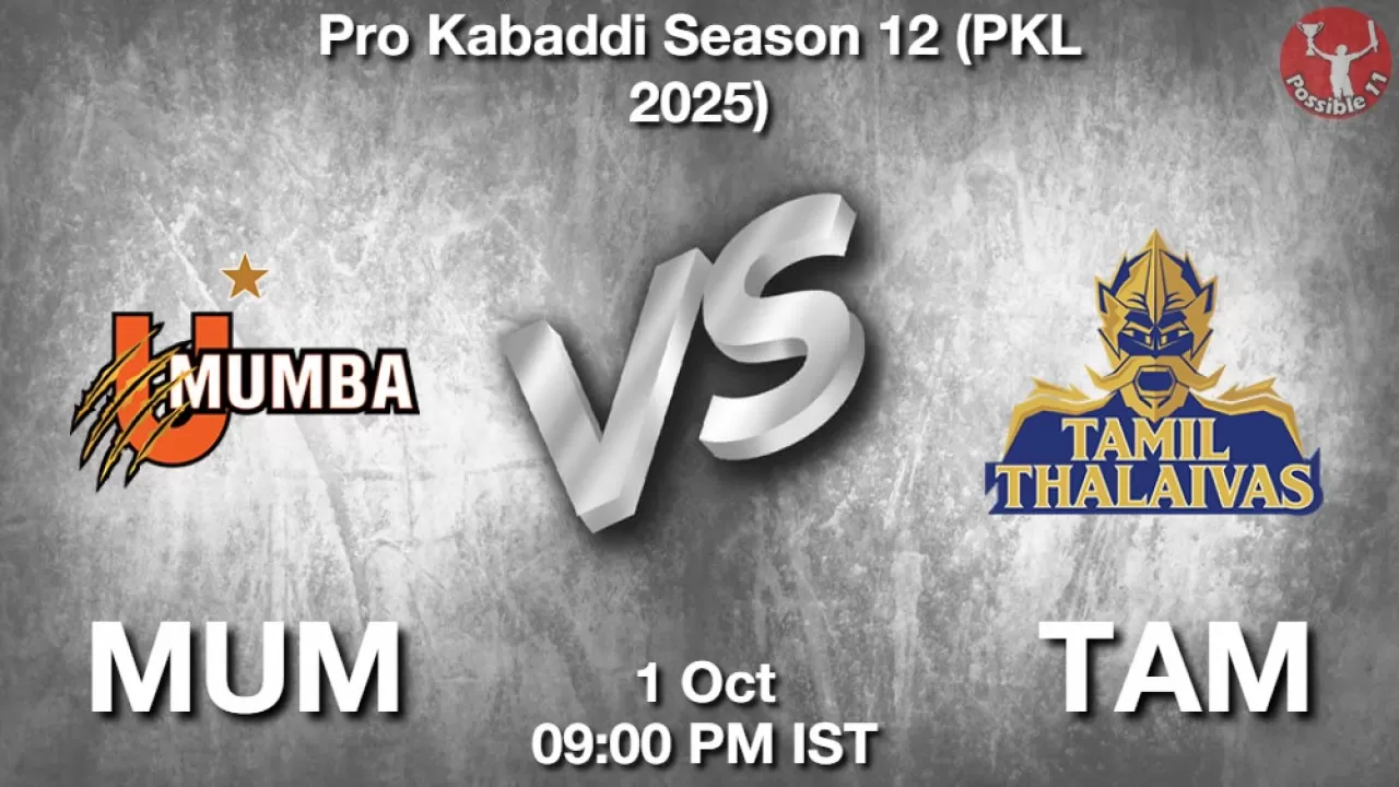MUM vs TAM Match Prediction, Pro Kabaddi Season 12 (PKL 2025), U Mumba vs Tamil Thalaivas Match Preview, Probable Playing 11, Match winning Tips, Live Match Score, Pitch Report, Injury & Updates.