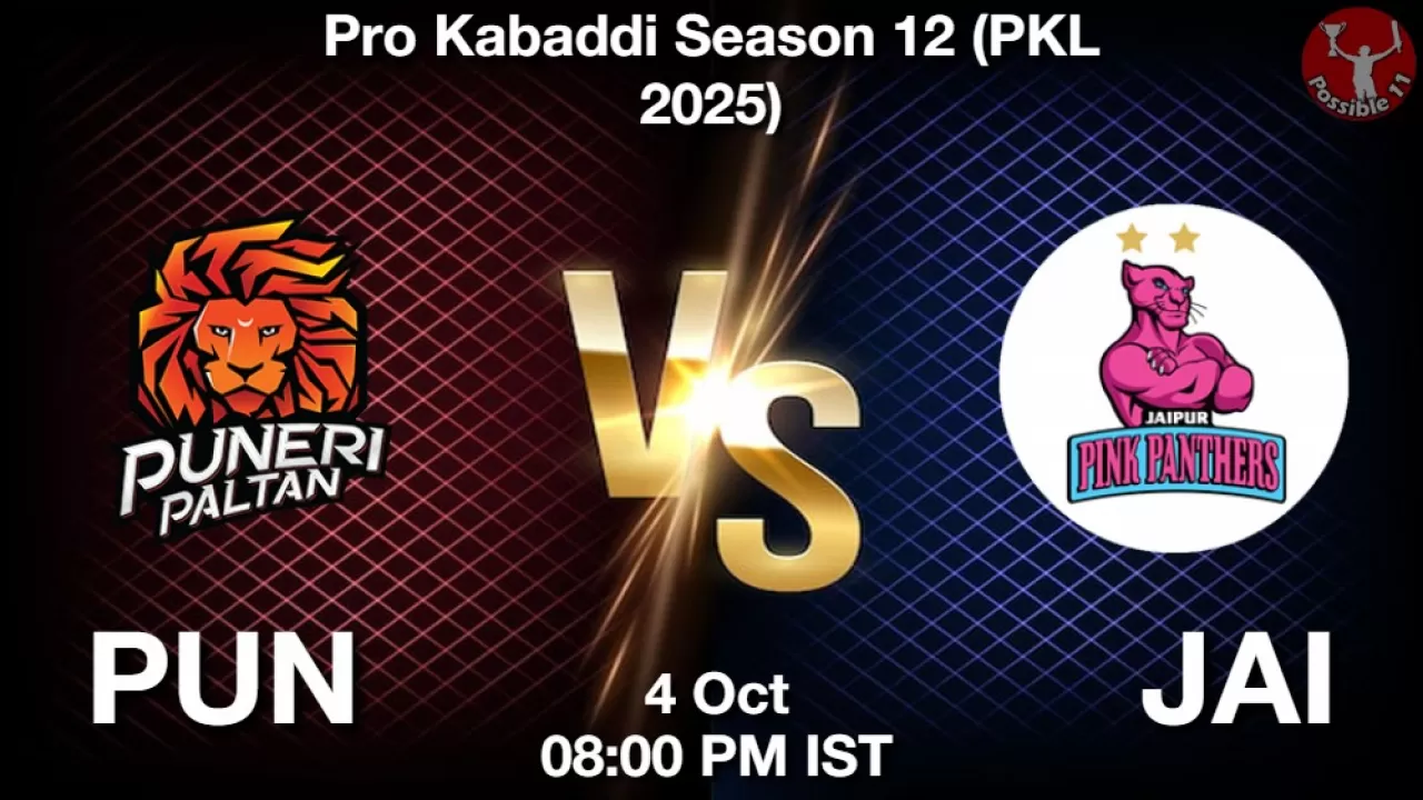 PUN vs JAI Match Prediction, Pro Kabaddi Season 12 (PKL 2025), Puneri Paltan vs Jaipur Pink Panthers Match Preview, Probable Playing 11, Match winning Tips, Live Match Score, Pitch Report, Injury & Updates.