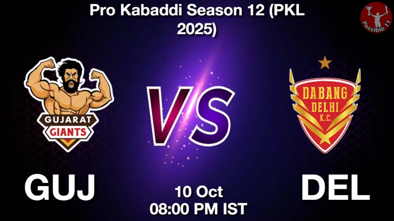 GUJ vs DEL Match Prediction, Pro Kabaddi Season 12 (PKL 2025), Gujarat Giants vs Dabang Delhi Match Preview, Probable Playing 11, Match winning Tips, Live Match Score, Pitch Report, Injury & Updates.