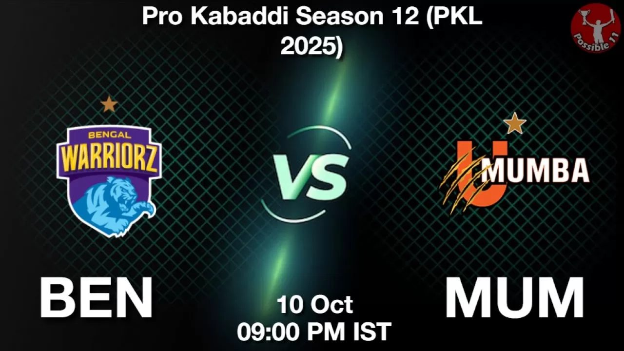 BEN vs MUM Match Prediction, Pro Kabaddi Season 12 (PKL 2025), Bengal Warriors vs U Mumba Match Preview, Probable Playing 11, Match winning Tips, Live Match Score, Pitch Report, Injury & Updates.