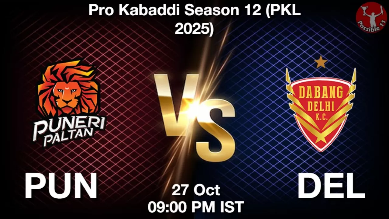 PUN vs DEL Match Prediction, Pro Kabaddi Season 12 (PKL 2025), Puneri Paltan vs Dabang Delhi Match Preview, Probable Playing 11, Match winning Tips, Live Match Score, Pitch Report, Injury & Updates.